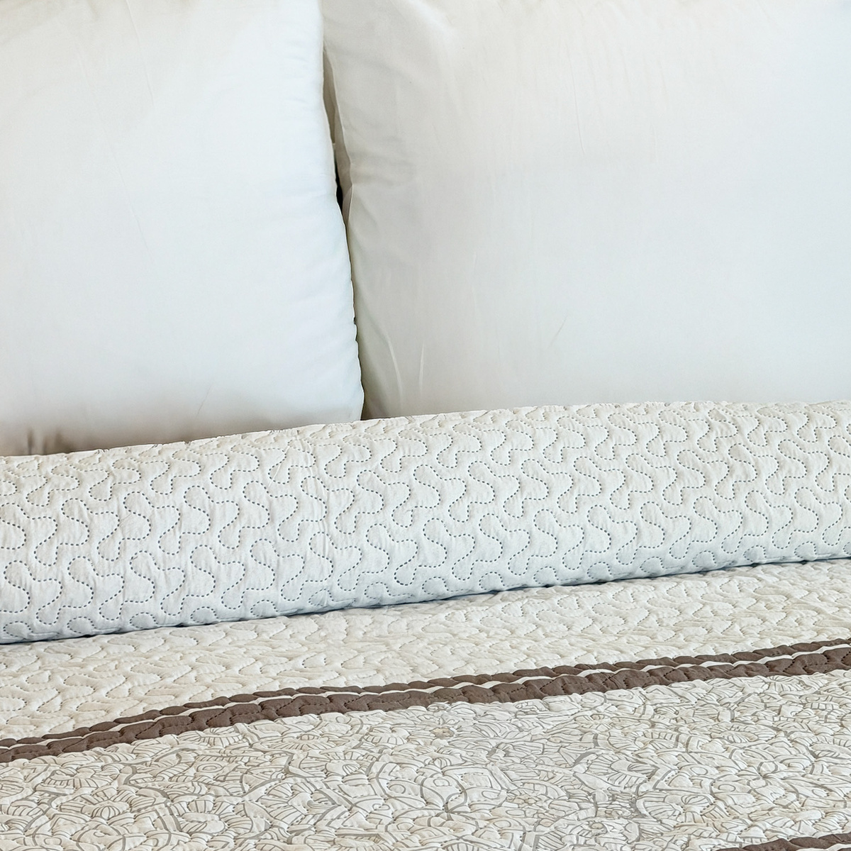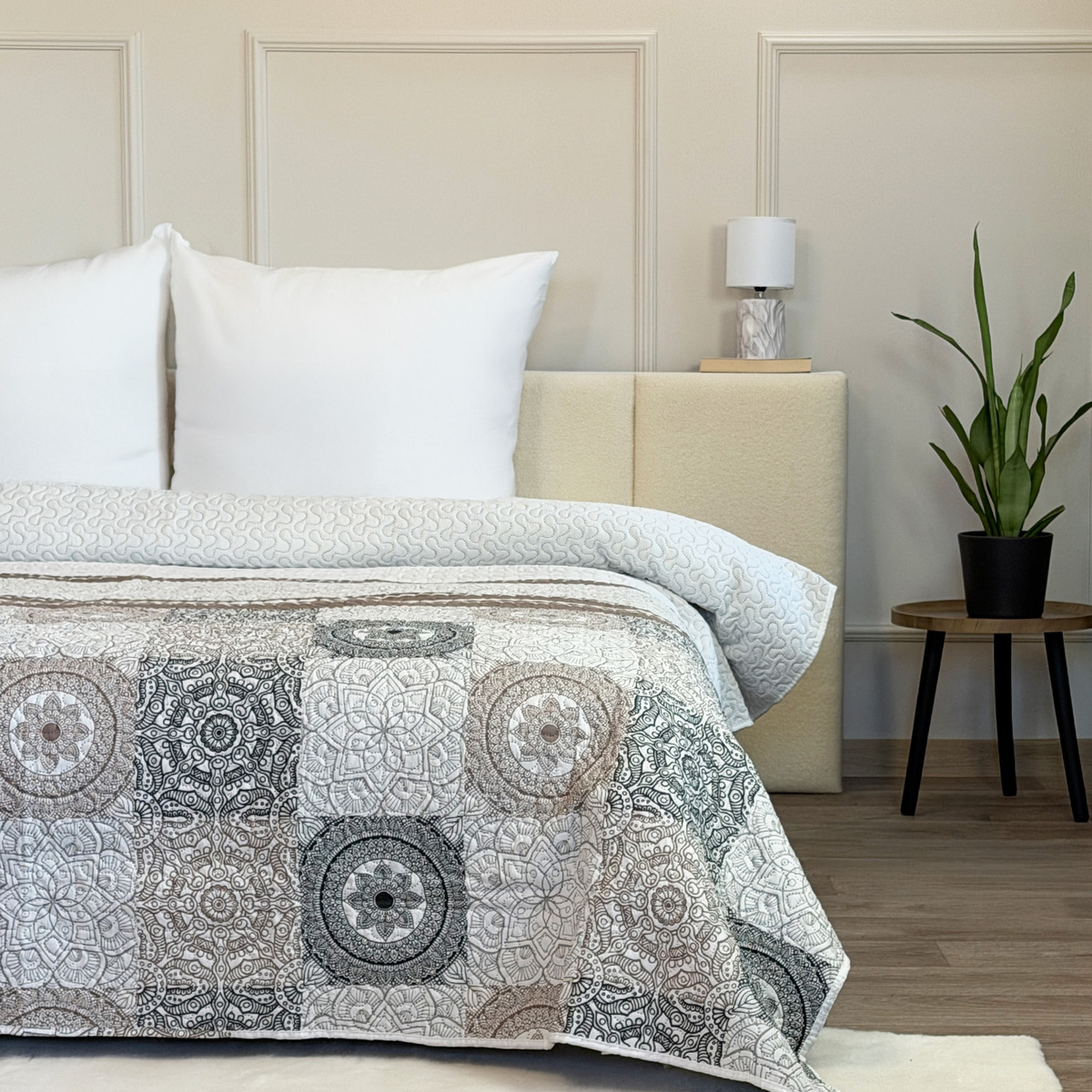 Nakrycie na łóżko wykonane jest z drukowanej tkaniny poliestrowej z delikatnym, tłoczonym wzorem.