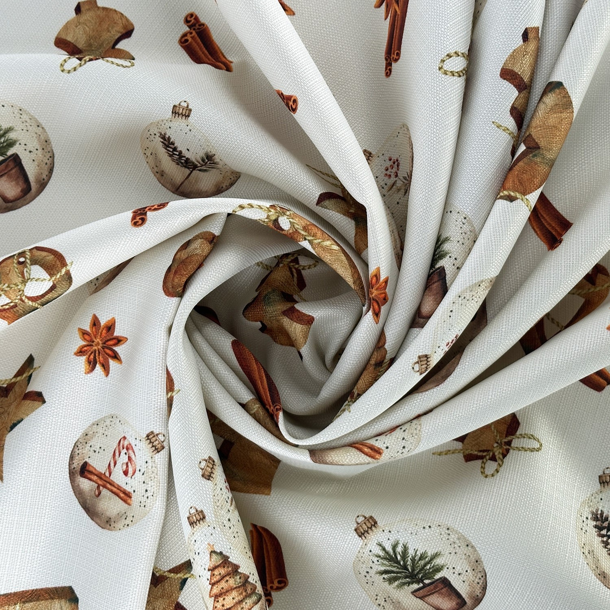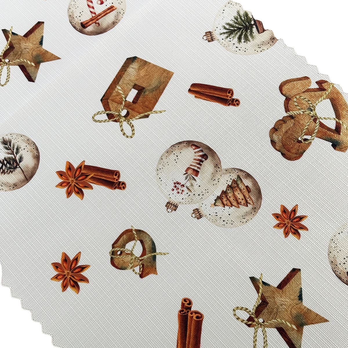 Tkanina z drukowanym motywem bożonarodzeniowym odpowiednio układa się na krawędziach blatu.