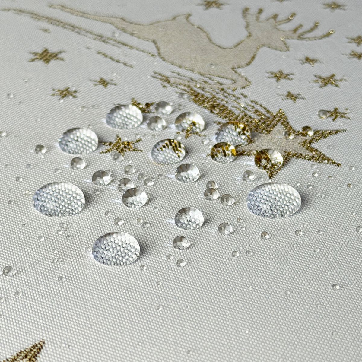 Obrus dwustronny posiada właściwości plamoodporne, dzięki temu rozlane płyny można zebrać z powierzchni tkaniny.