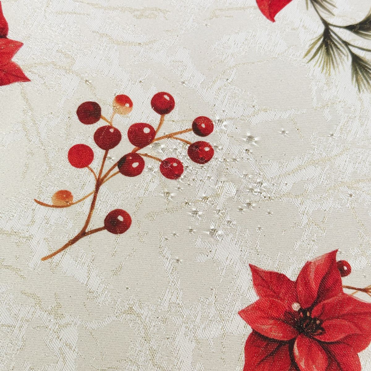 Obrus dwustronny posiada właściwości plamoodporne, dzięki temu rozlane płyny można zebrać z powierzchni tkaniny.