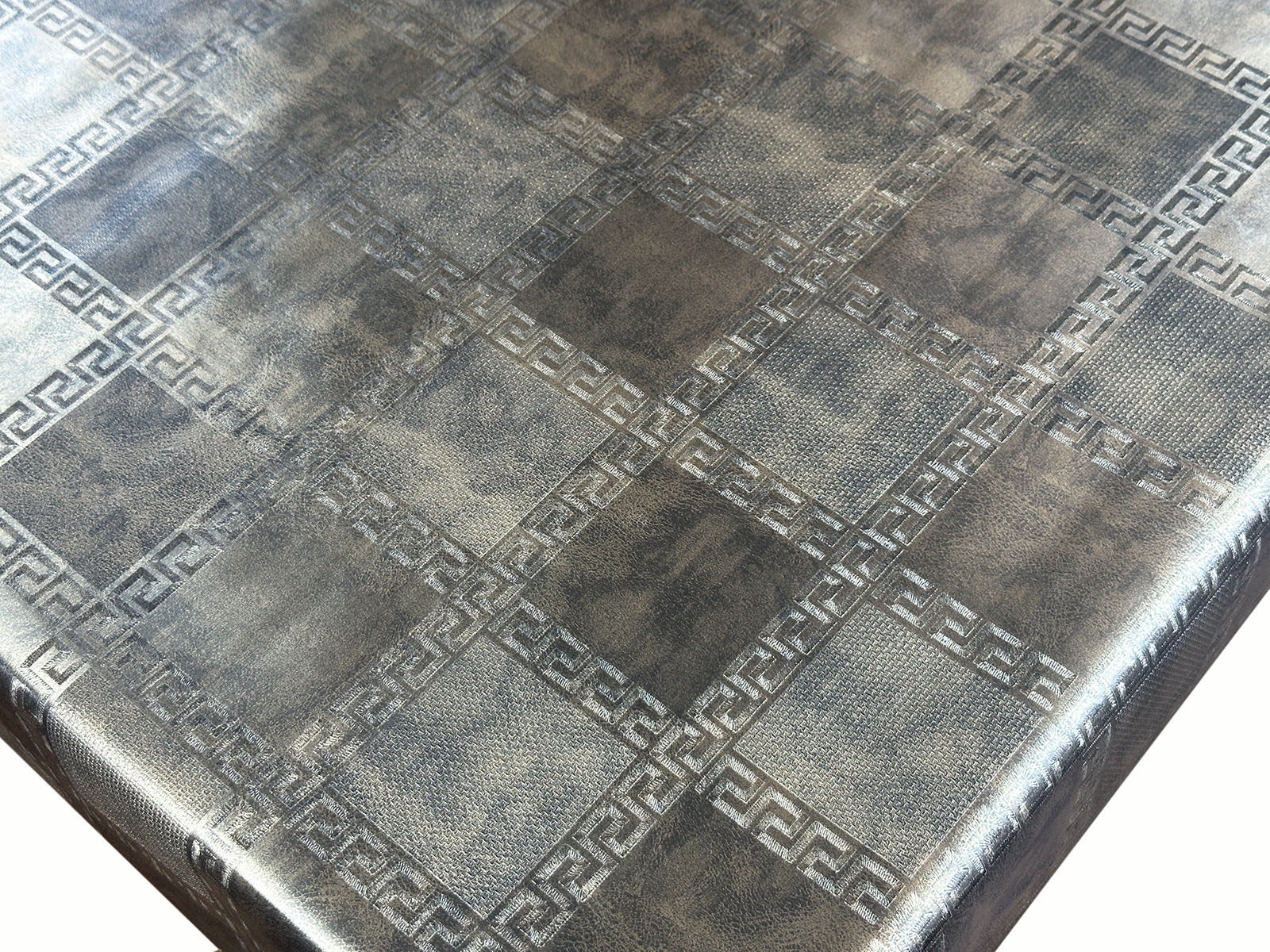 Cerata 140 Metallico na podkładzie z tkaniny poliestrowej. Eleganckie, jednobarwne, tłoczone wzory 3D, imitujące grawerowany i szczotkowany metal. Skład: drukowana folia 100% PCV na podłożu ze 100 % tkaniny poliestrowej.