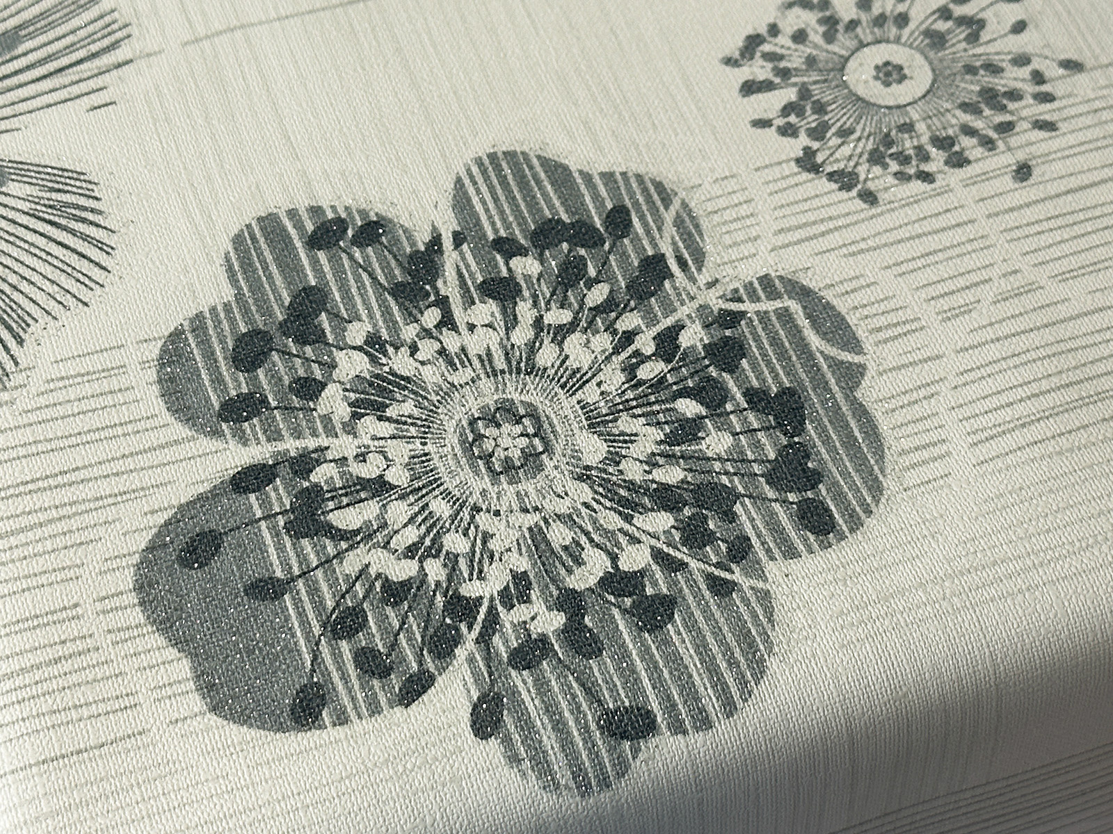 Cerata z nadrukowanymi wzorami, pokrytymi brokatem.