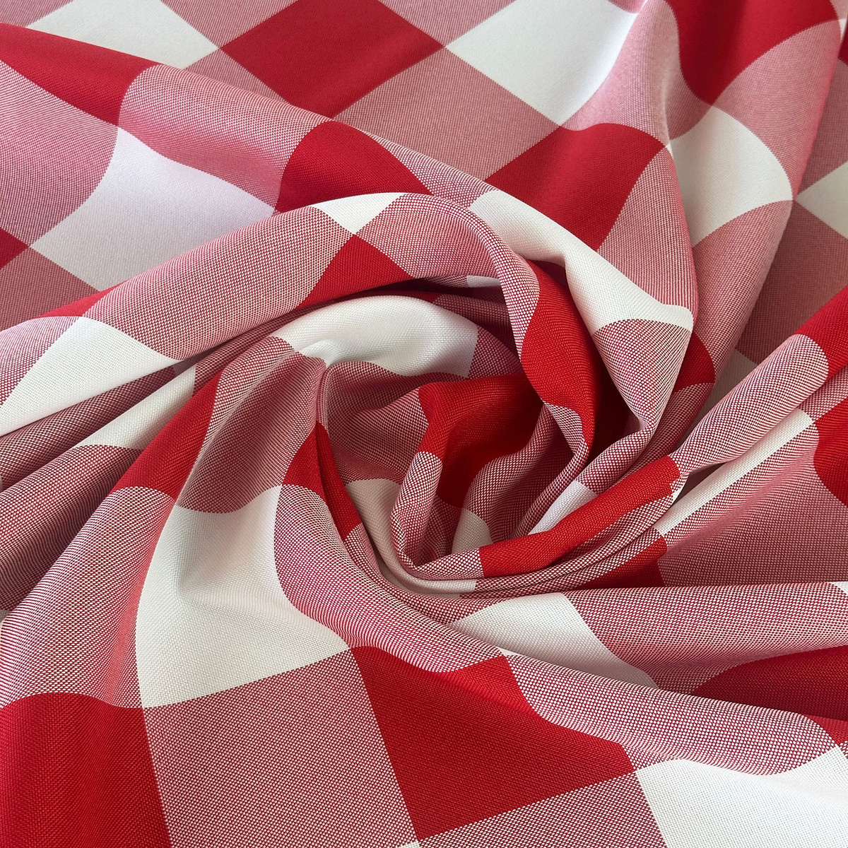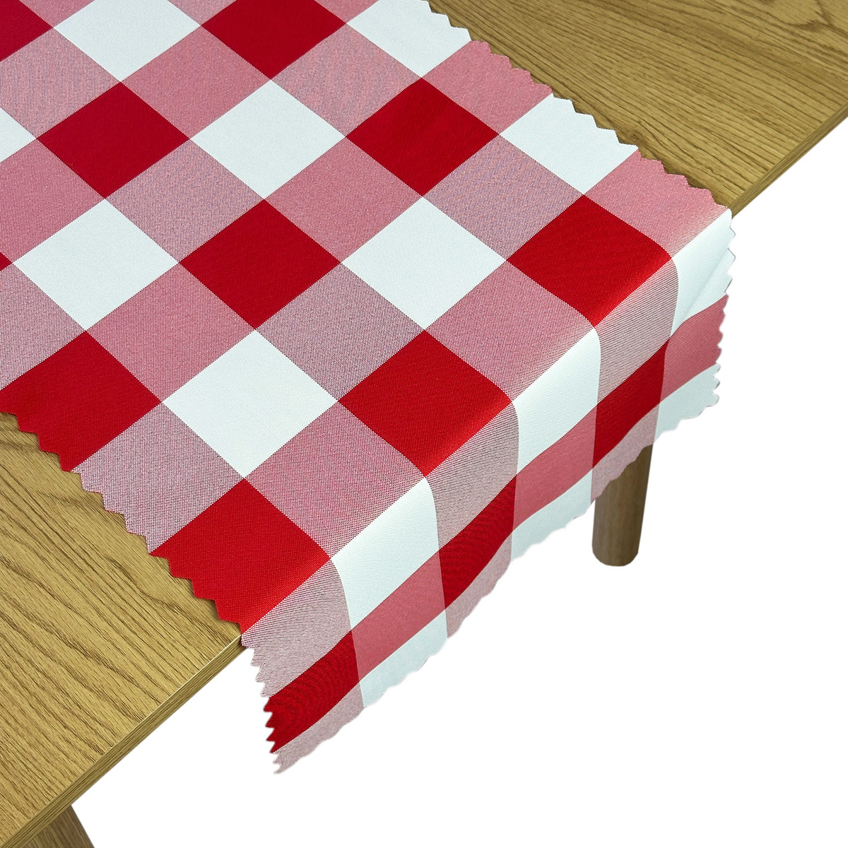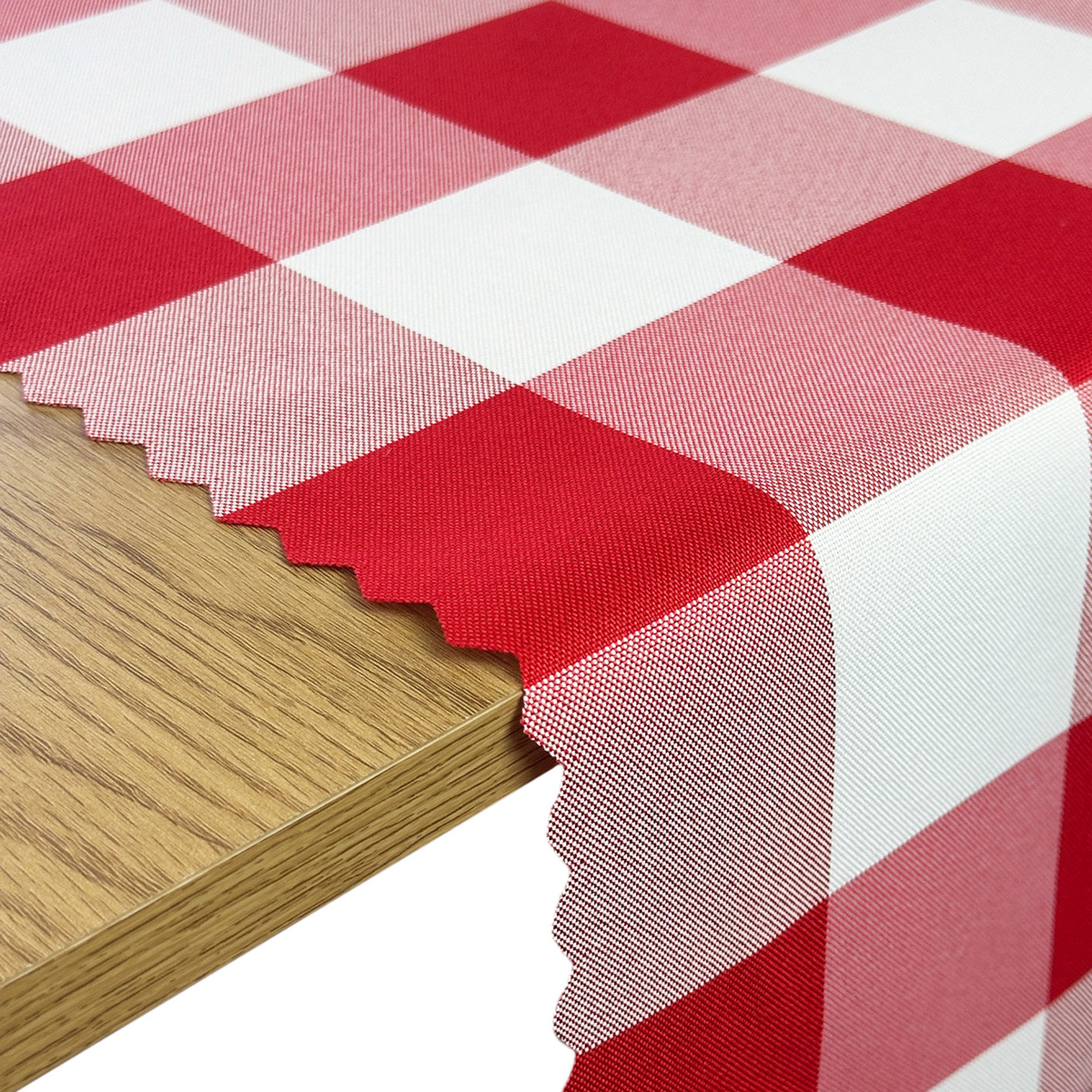 Tkanina z drukowanym motywem kratki odpowiednio układa się na krawędziach blatu.