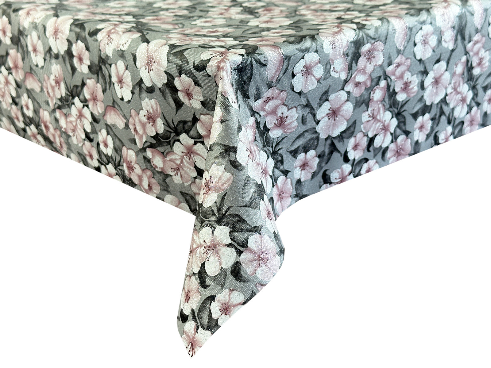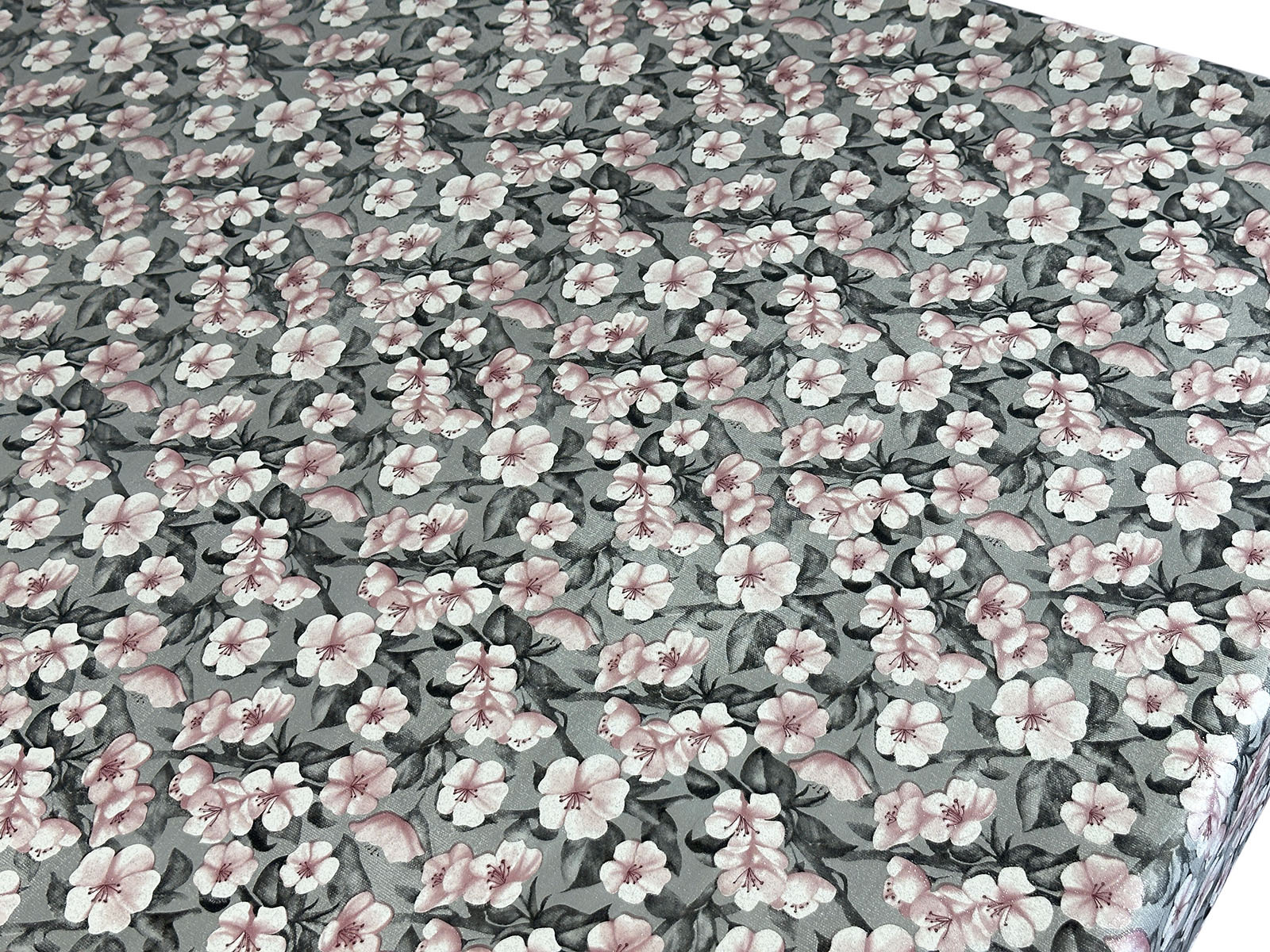 Cerata imitująca tkaninę z nadrukowanymi wzorami, pokrytymi brokatem.