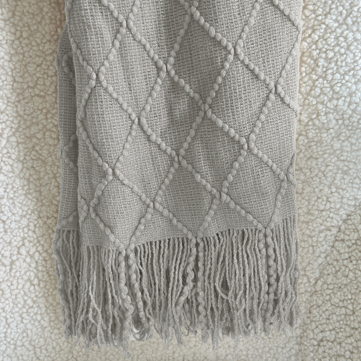 Koc z frędzlami jest miękki i przyjemny w dotyku, zapewnia komfort zarówno podczas chłodnych wieczorów, jak i jako dekoracyjny dodatek do salonu lub sypialni.