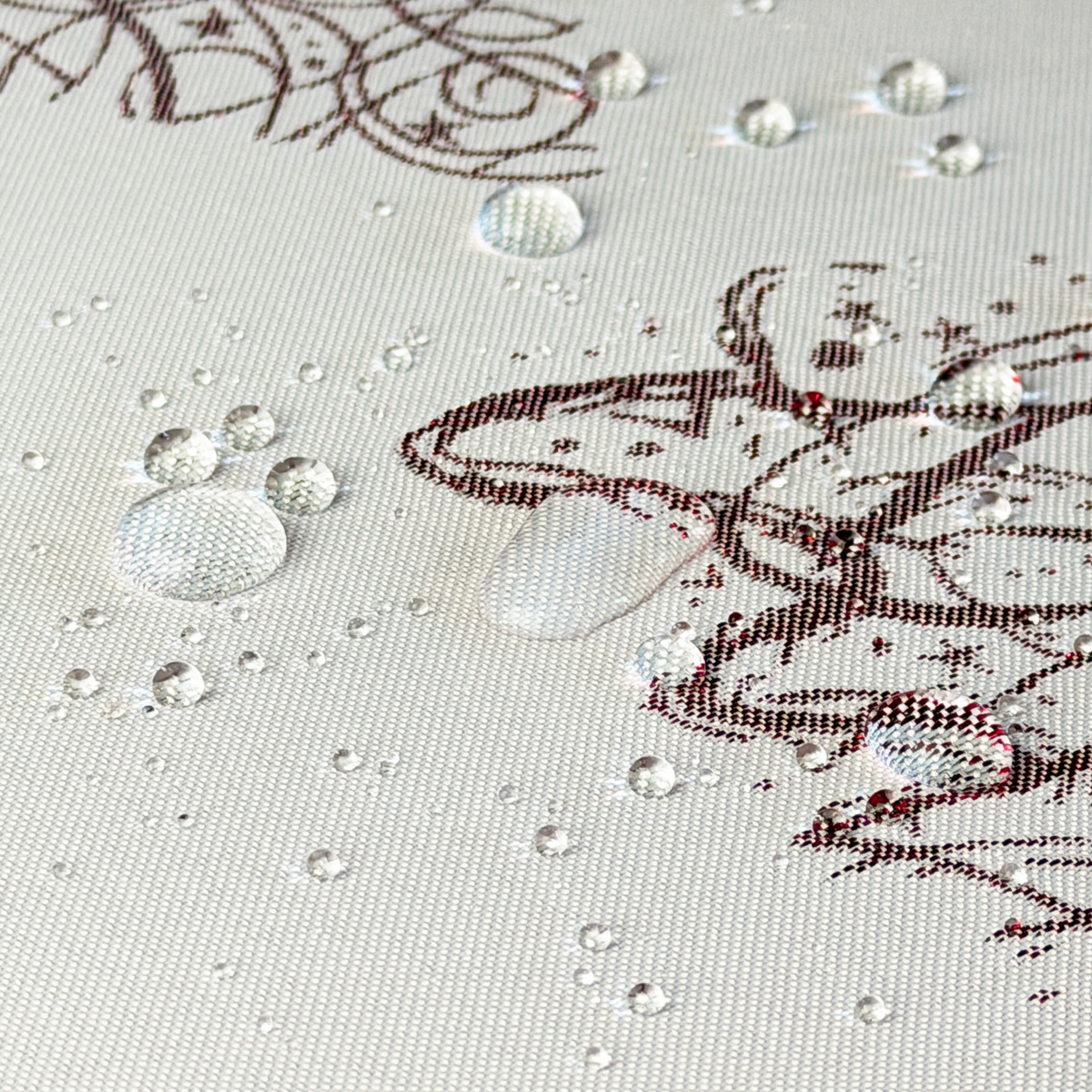 Obrus dwustronny posiada właściwości plamoodporne, dzięki temu rozlane płyny można zebrać z powierzchni tkaniny.