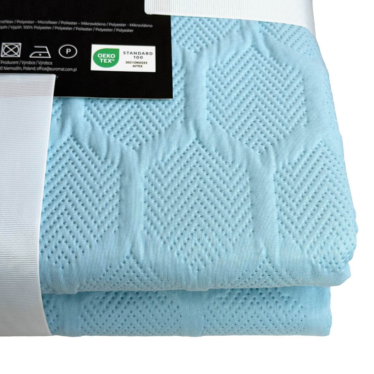 Nakrycie na łóżko wykonane jest z drukowanej tkaniny poliestrowej z delikatnym, tłoczonym wzorem.