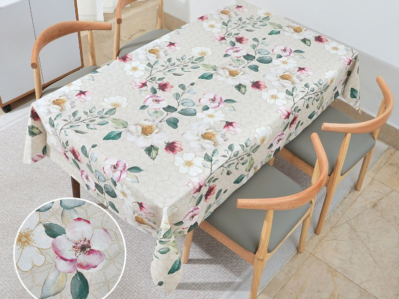 Dzięki zastosowaniu wodoodpornej powłoki tkanina jest praktyczna w użytkowaniu, łatwa w utrzymaniu czystości oraz odporna na drobne zabrudzenia. Doskonale sprawdzi się jako materiał na obrusy, bieżniki, podkładki stołowe, dekoracje wnętrz oraz inne projekty tekstylne.