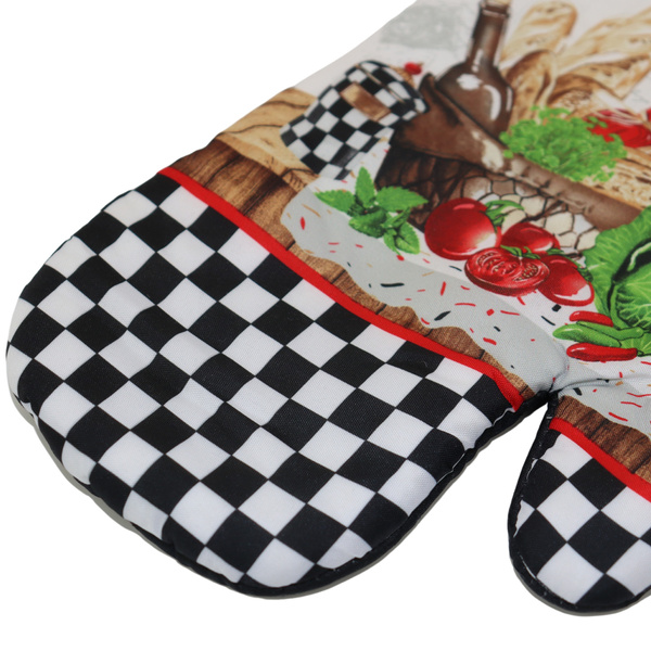Rękawiczki kuchenne charakteryzują się nadrukowanym motywem, wszytymi magnesami oraz uchwytami, dzięki którym można je zawiesić. Rękawice do kuchni są uniwersalnym akcesorium kuchennym, posiadają klasyczny kształt oraz wydzielone miejsce na kciuk.